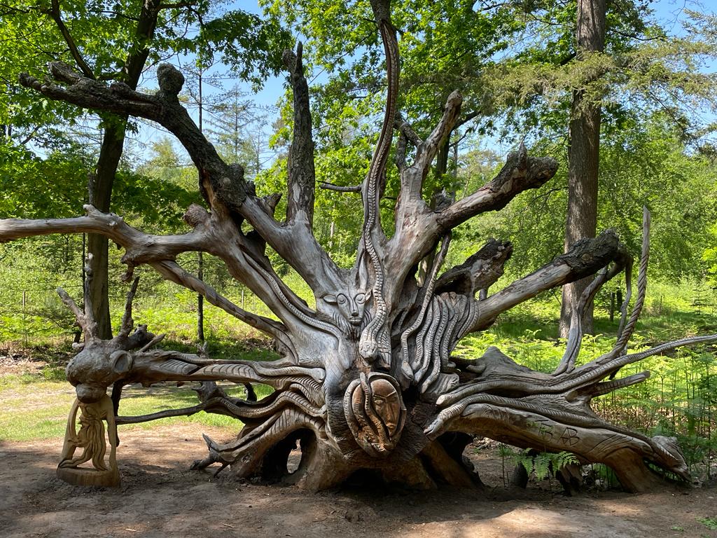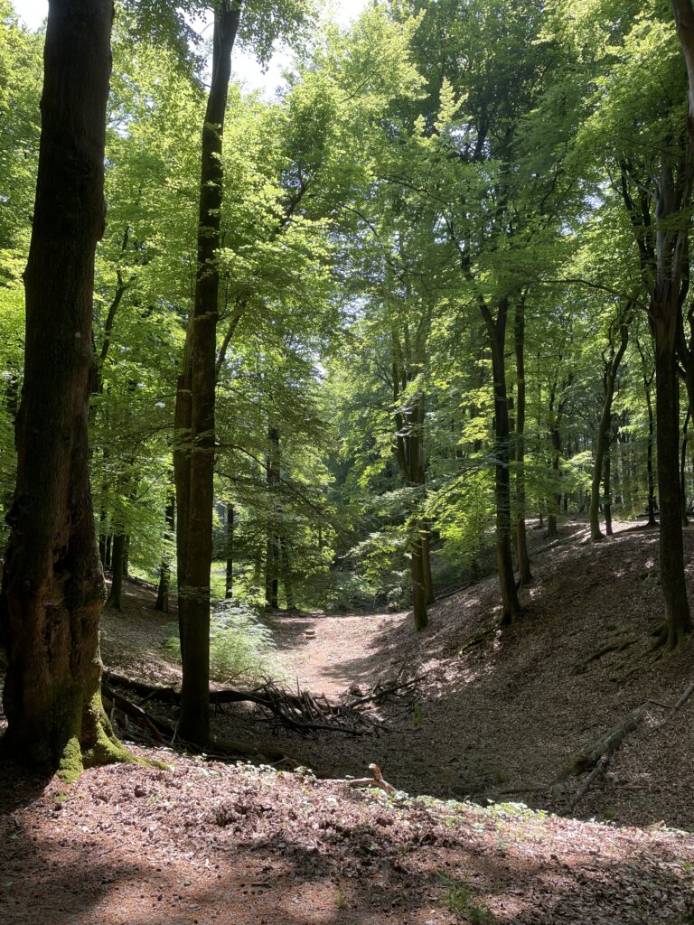 - Historische schatten – Je vindt in het bos eeuwenoude grafheuvels en het mysterieuze Solse Gat (nr 4 op de kaart), een legendarische plek waarvan wordt gezegd dat hier ooit een klooster in de aarde verdween. Deze mysterieuze leemkuil is ontstaan door smeltend ijs in de ijstijd en later verder uitgehold door boeren die leem afgroeven. Wat overbleef, is een moerassige kuil van ongeveer 40 bij 20 meter, omringd door flora en fauna. In en rond het Solse Gat groeien zeldzame plantensoorten zoals de bosanemoon, de slanke sleutelbloem en het waterdrieblad. Wilde dieren trekken naar de poel om hier te drinken, waardoor je kans hebt om edelherten, wilde zwijnen en dassen in hun natuurlijke omgeving te spotten. In het bos vindt je ook diverse houtsnijwerken, zoals het monument van Medusa (nr 5).